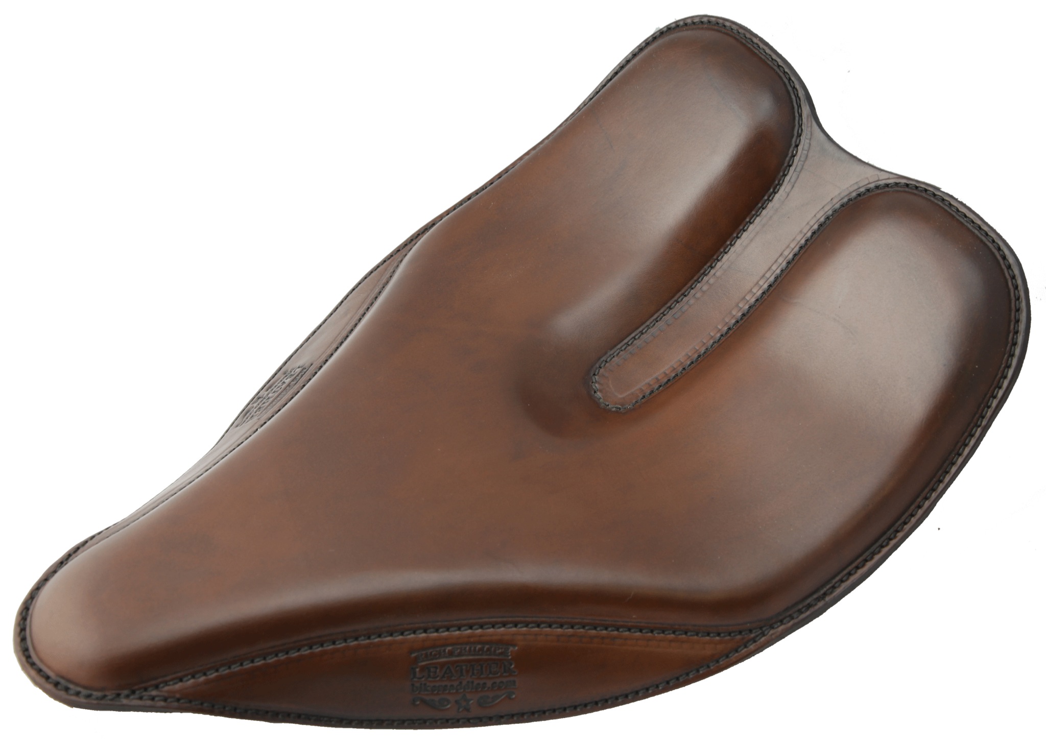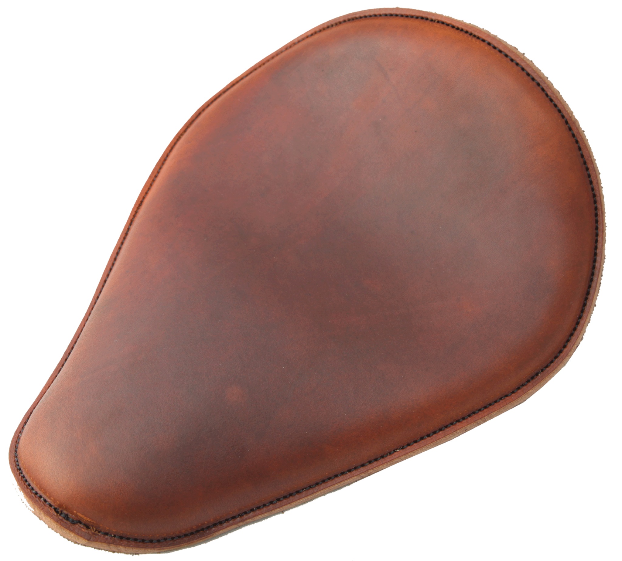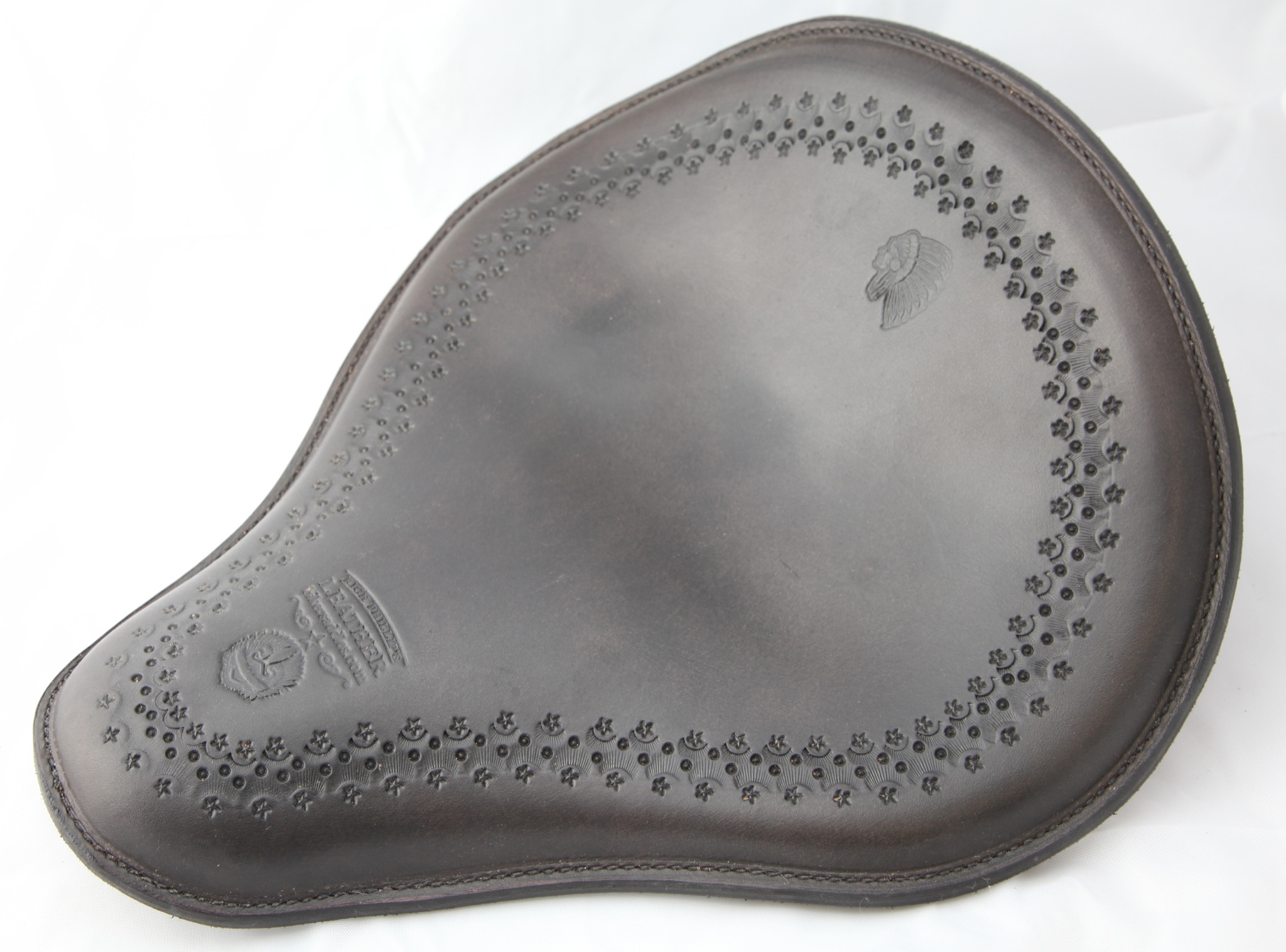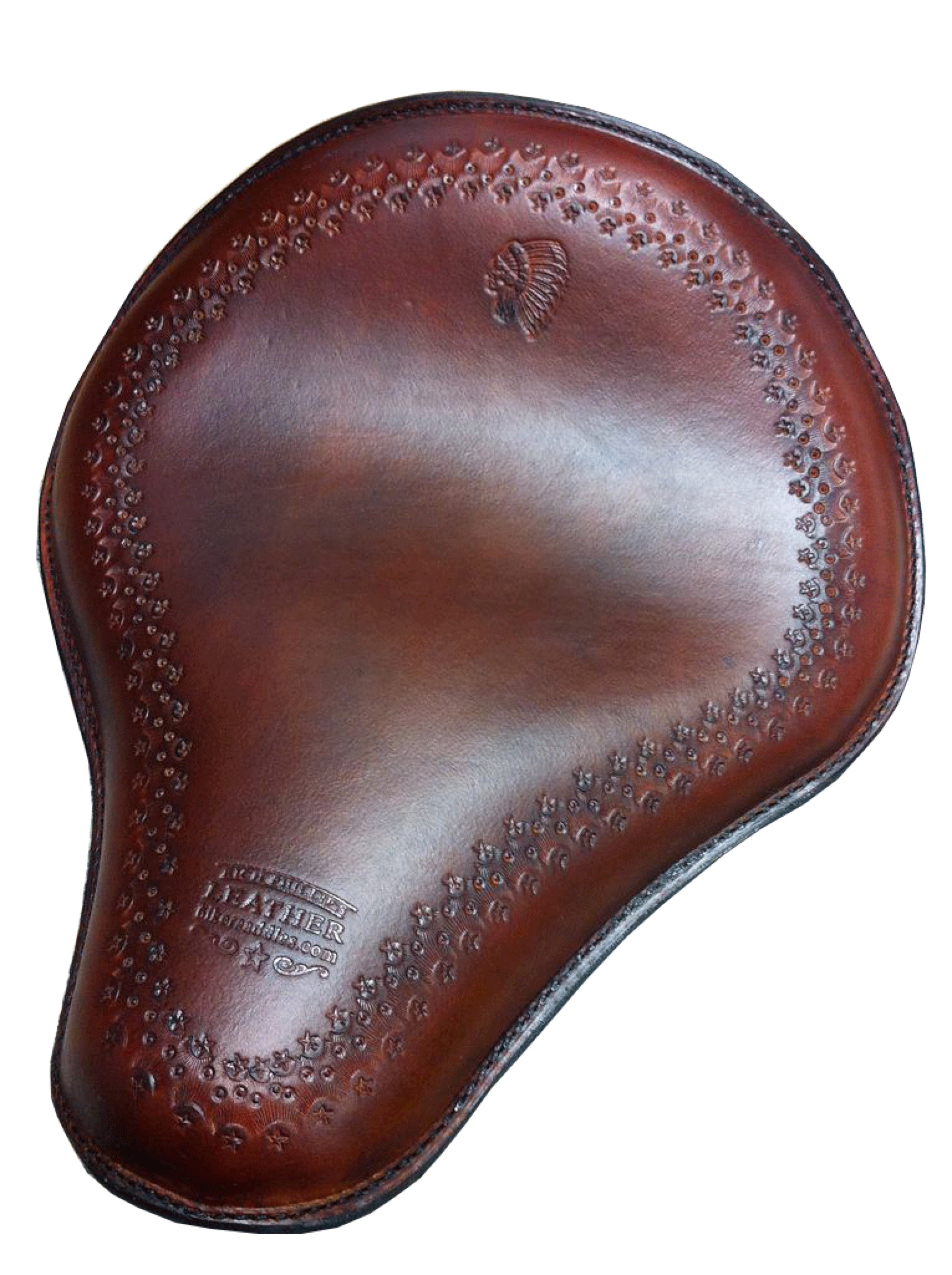 12 by 13 hand tooled veg tanned seat shown in brown. has bolts welded to bottom for the spring mounts and seat hinge. Will work with all of our sportster kits as well as custom applications.