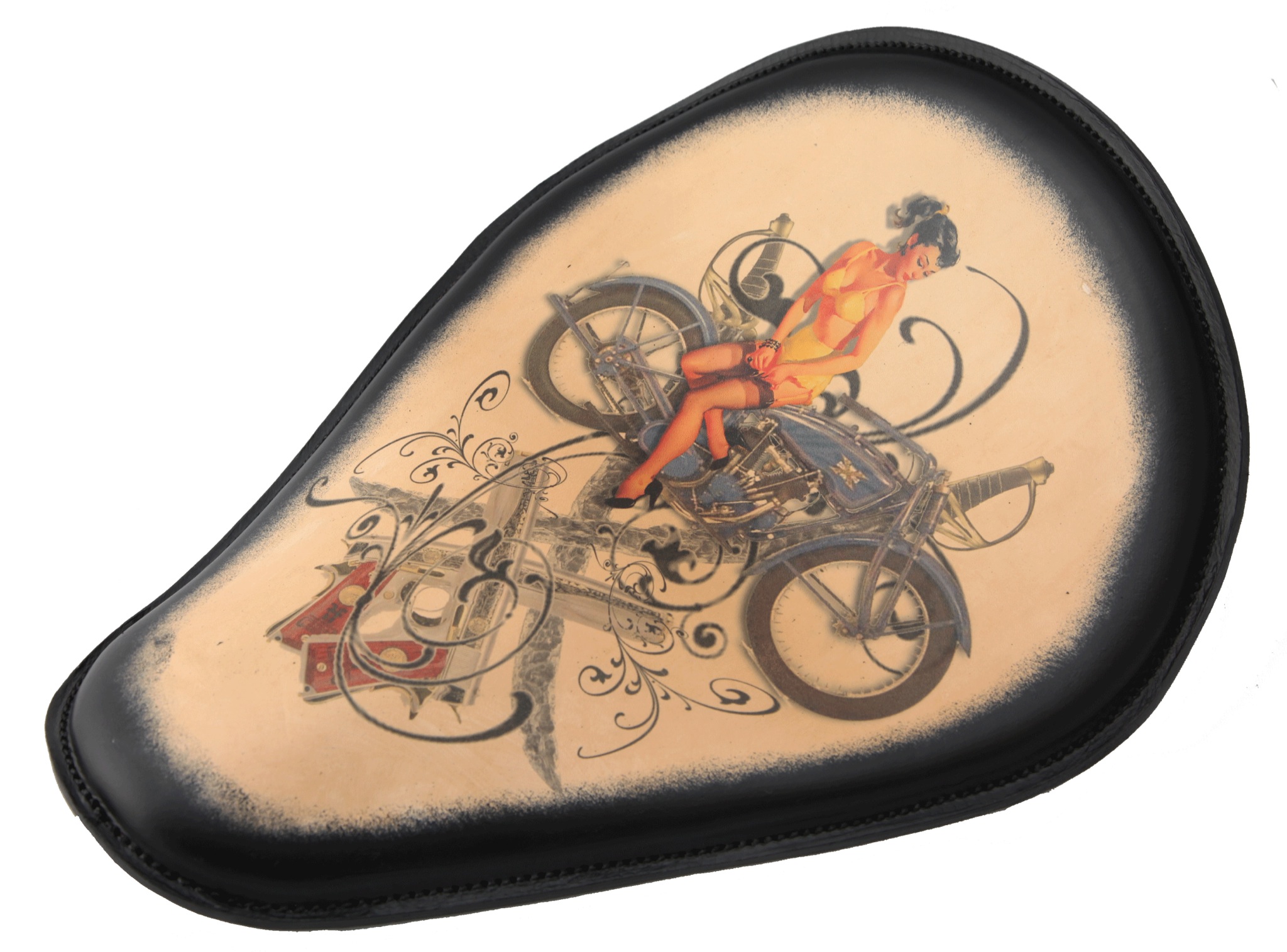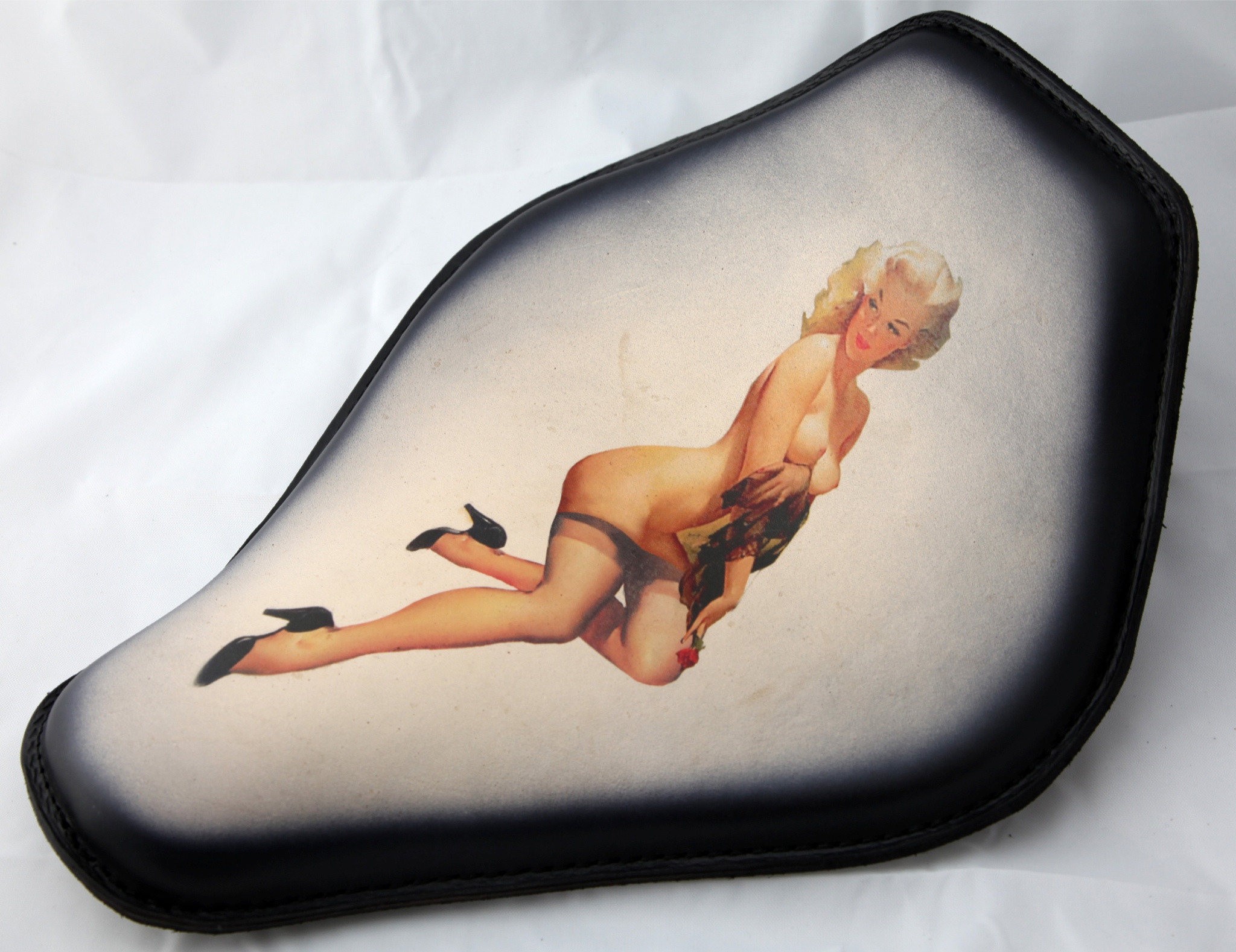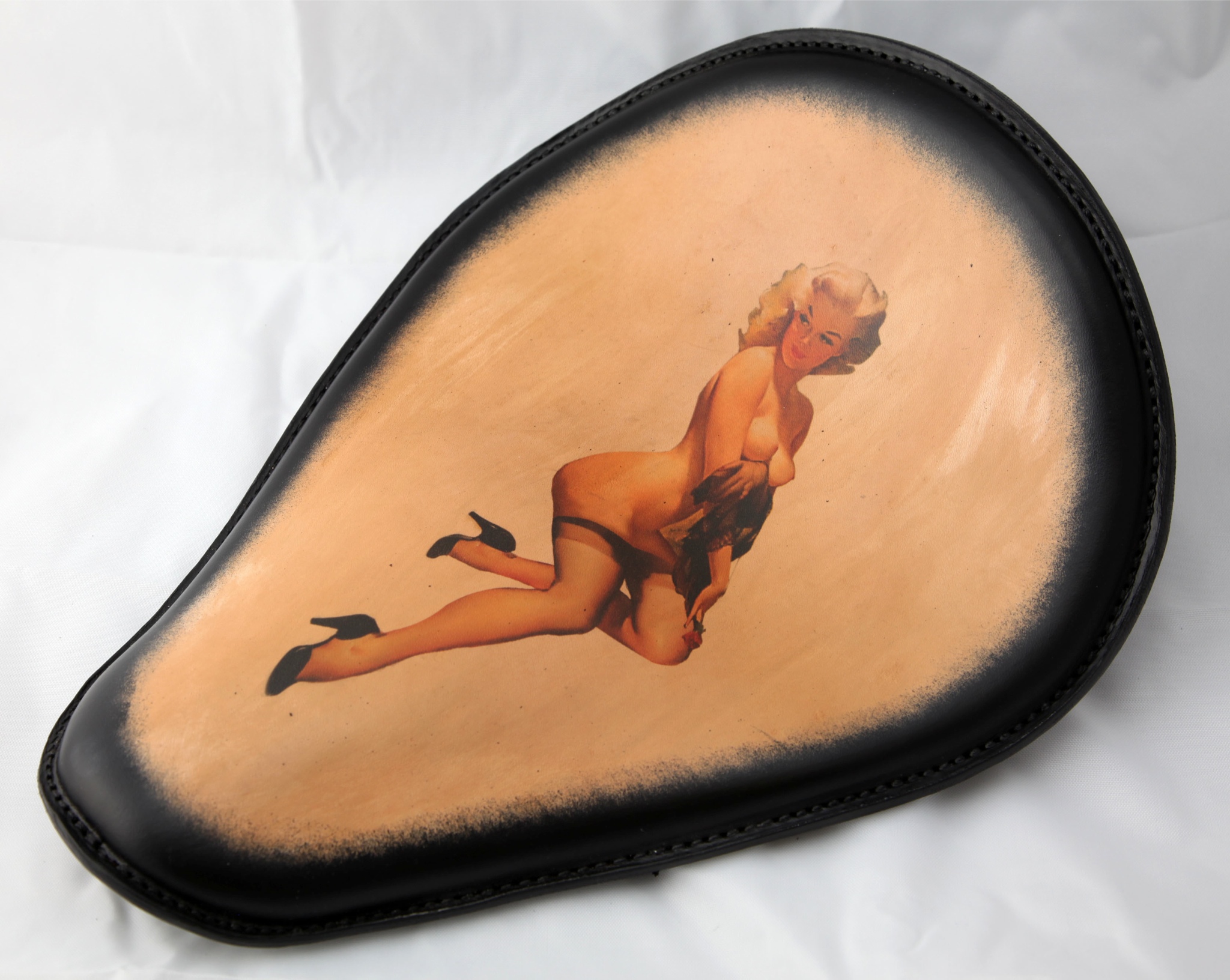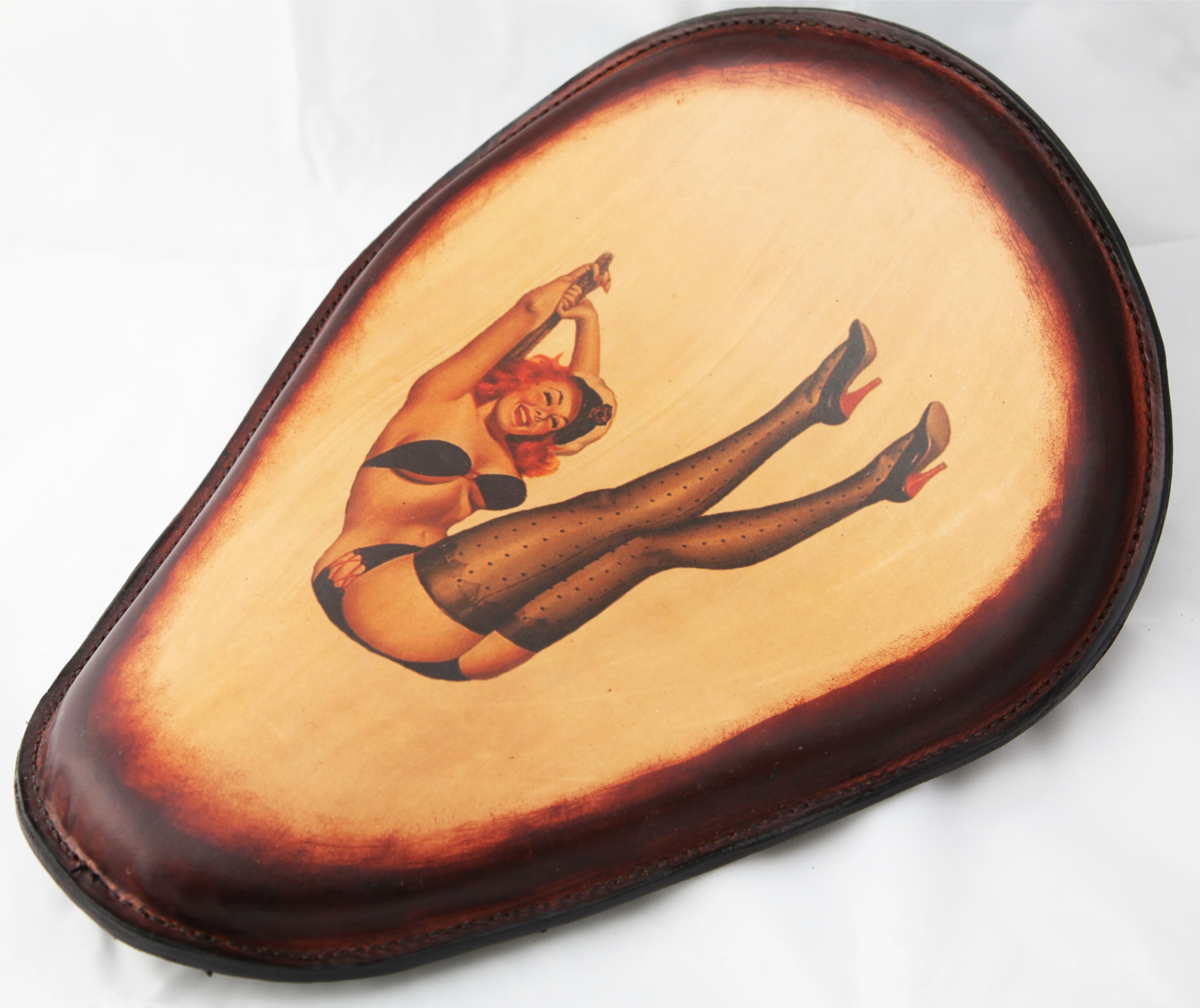 THIS A VEG. TANNED TOP WITH CUSTOM ARTWORK APPLIED TO IT. IT IS WATERPROOFED WITH A SPECIAL UV COATING THAT PROTECTS THE IMAGE. THE SEAT MEASURES 10” WIDE BY 13” LONG THE REAR BOLTS ARE SPACED AT 7” APART. IT WILL WORK WITH ANY OF OUR SPORTSTER HARDWARE SETUPS ALONG WITH OUS UNIVERSAL MOUNTS.